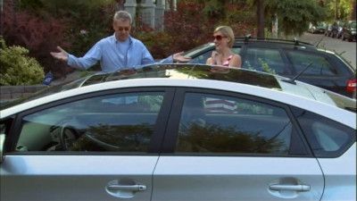 E12PriusGeorge takes his kids, Sidney and Abe for a fancy meal where they suggest he trade-in his BMW for a Prius, especially given he is trying to produce a project with an environmentally sensitive film company. Later on in the day, during a shopping excursion with Claire, she asks him to buy a car. Considering a big-ticket purchase like that akin to a serious commitment, George recoils. Doug suggests George draw up a 'pre-purch' agreement, a sort of pre-nuptial that will make the car defer to him if their relationship ends. When Claire hears of the idea she's insulted. To make amends and prove his commitment to her, he offers to drive her kids and their nanny to a birthday party hosted by a film financier. At the party, George wreaks havoc even getting into a shoving match with the clown.  - I Never Met a Phor I Didn't Use