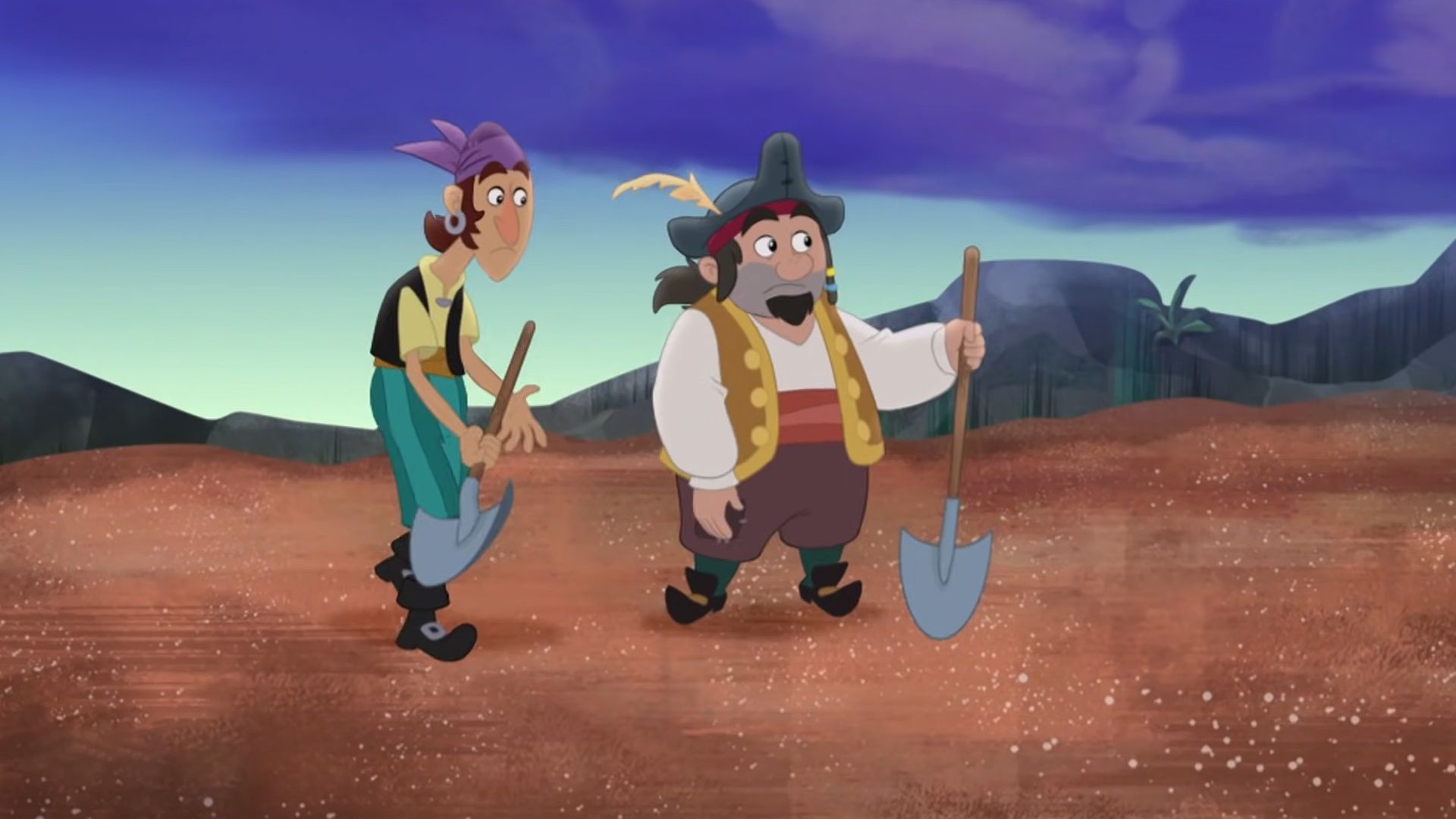E11Pirate-Sitting PiratesJake, Izzy, Cubby, Captain Hook and Tick Tock Croc all turn into babies after accidentally sliding out of control into the Pirate Pool of Youth. So Skully, Mr. Smee, Sharky and Bones babysit them and look for the Grandfather Gladiola flower to turn them back to normal. - A Royal Misunderstanding