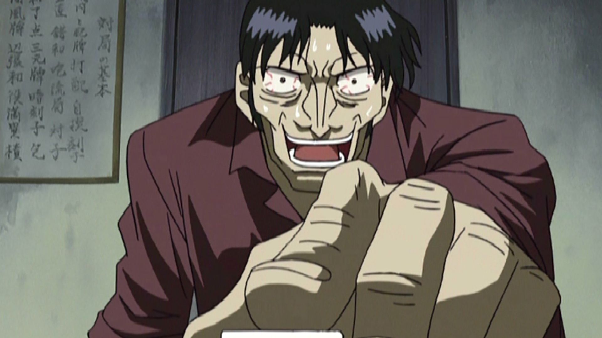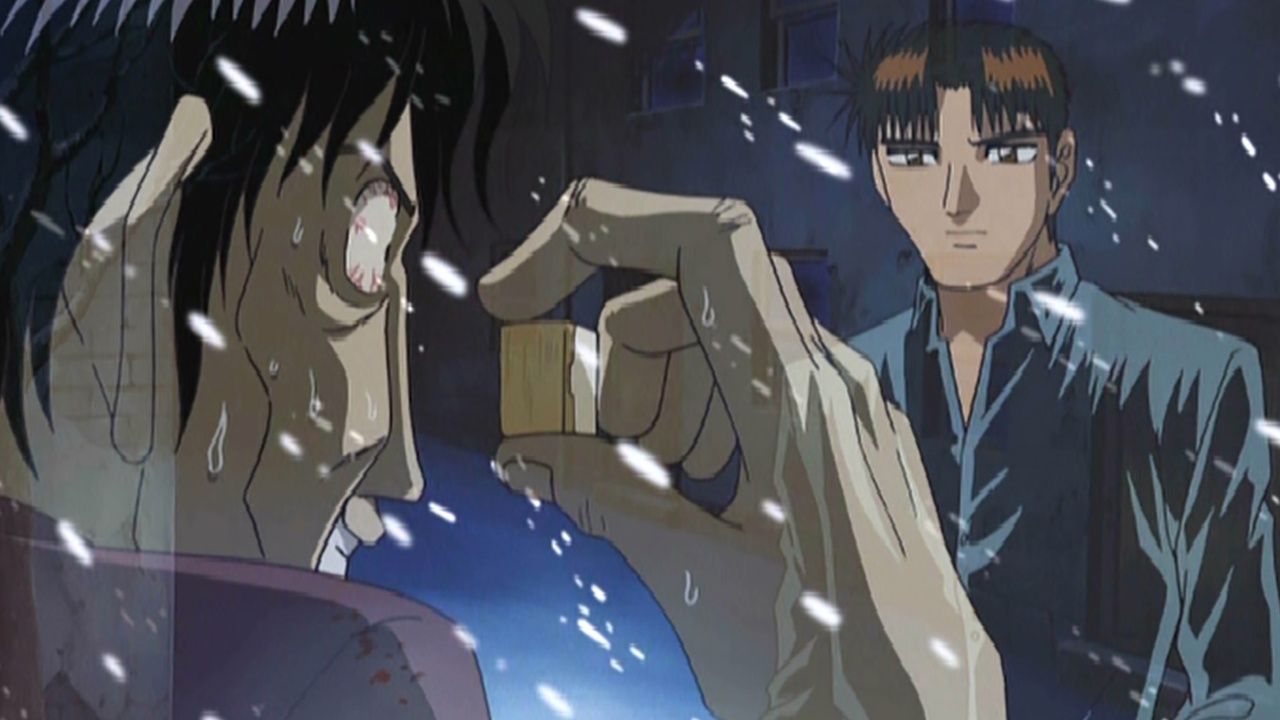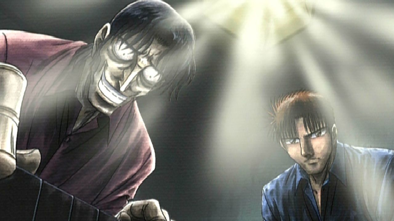 E9The Battle Against DeathInnami was the first true gambler Tetsuya had met years ago. When Tetsuya saw Innami in his current state, he felt no compassion towards him. On the contrary, he decided it was his duty to stick the final nail in his coffin! In order to counter Innami's All-Seeing Eye, Tetsuya forced him to play with a set of black plastic tiles. As was expected, Innami panicked and his game crumbled into pieces. But then, amidst his desperation, a feint, creepy grin started rising to his face… - The Devil’s Eye Returns