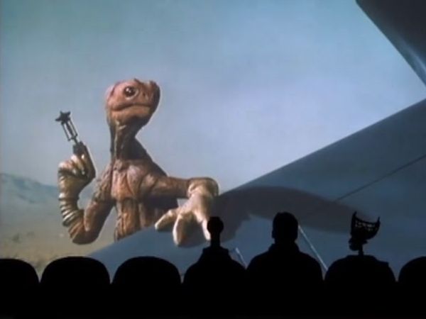 In the theater, the crew watches as a disaffected teen with a cool van discovers an alien weapon in the desert and is driven to go on a killing spree in "Laserblast" (1978).