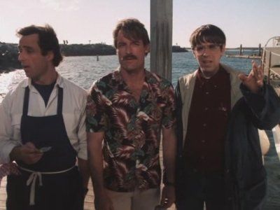 E20If You Can't Beat 'Em, Join 'EmThe penultimate episode of Riptide is a great send up of the ABC series Moonlighting. The Riptide guys get hired by a TV producer to "train" the two stars of his new series. The two stars follow the guys around on a case to get a little on-the-job training. H. Richard Greene turns in a great performance as Cary Russell doing his best David Addison (Bruce Willis) the whole way.