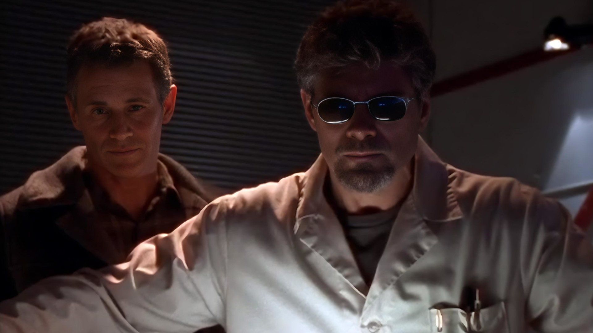 E12Double HelixSince Dr. Martin Nodel is the most brilliant geneticist in the world, the students and staff at the university are willing to put up with a few eccentricities -- unlike his son Paul, who gets impatient with his father's behavior. However, Dr. Nodel's behavior goes beyond eccentric after he unveils his research into introns, mysterious genetic material which he believes hold the code for future evolution. After a successful animal test, Nodel secretly tries the formula on himself, with amazing and disturbing results. As his intelligence begins to grow, so do scales on his hands, strange markings on his body, and a mysterious hole in his back. And he seems to be getting instinctive messages telling him to bring 'subjects' to a remote wilderness location. When he arrives there, accompanied by six students including Paul and his girlfriend, he finds a group of heavily armed soldiers and the key to unlocking a mystery that goes far beyond human science. - Music of the Spheres