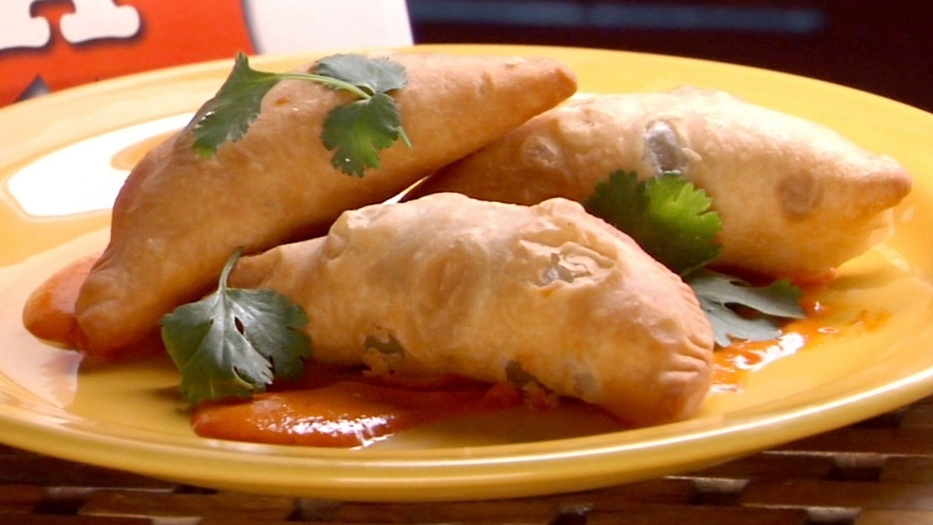 * Beef and Goat Cheese Empanada with Piquillo Pepper Sauce and Pickled Red Onion