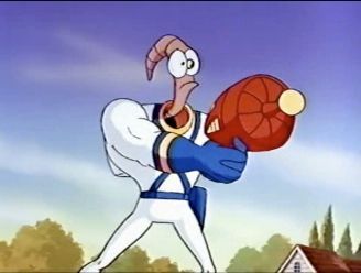 Jim was a multi-celled life form happily burrowing through the topsoil. His life changed in a flash when an extraterrestrial super-suit fell out of the sky. Instantly transformed from a 98 gram weakling into a muscular worm endowed with superpowers, extraordinary strength and the ability to leap incredible heights and distances, the suit renders him invulnerable. Earthworm Jim - daring defender of Earth, the cosmos and everything in between!