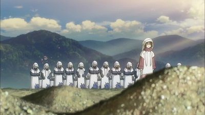 E7Battle in a New DimensionFestums cause chaos by attacking Srinagar, the base where the Tatsumiyajima expeditionary force is stationed, from both inside and outside. Maya runs to Yumiko and Miwa, but is shocked when she sees what Miwa looks like after trying to make contact with a Festum. - Dreaming of Peace