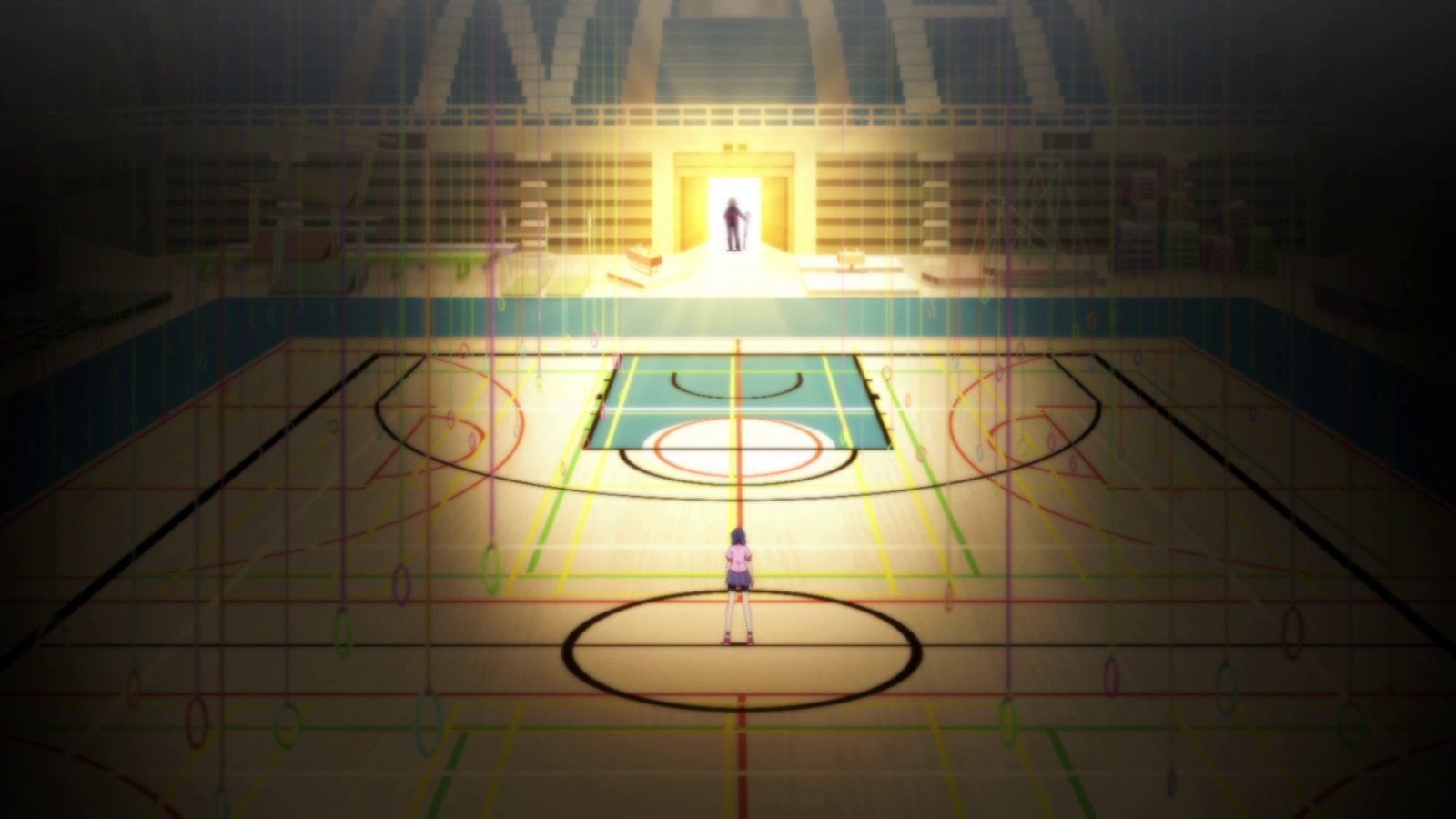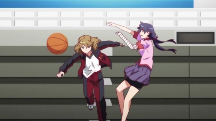 E17Hanamonogatari: Suruga Devil (5)Upon finding the Demon's head, she meets Rouka once again. Instead of giving the head to Rouka, she refuses. She is unable to stand the sight of her because of the fact that she can see her as she is a ghost. Suruga then challenges Rouka to one-on-one basketball in a wager for the head if Suruga loses. - Tsukimonogatari: Yotsugi Doll (3)
