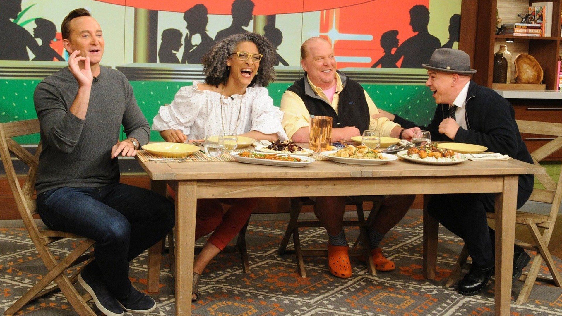 E176Simple Market MealsDerek Hough ("World of Dance") partners with dance enthusiast Carla Hall, who shows him all the right moves to make his favorite dessert, Banana Cream Pie. Mario Batali creates a fresh-from-the-market dish of Grilled Wings with Focaccia Panzanella, and Clinton Kelly faces off with Carla Hall to determine which cheese fries taste best – homemade or store-bought? - Sensational Summer Sweets