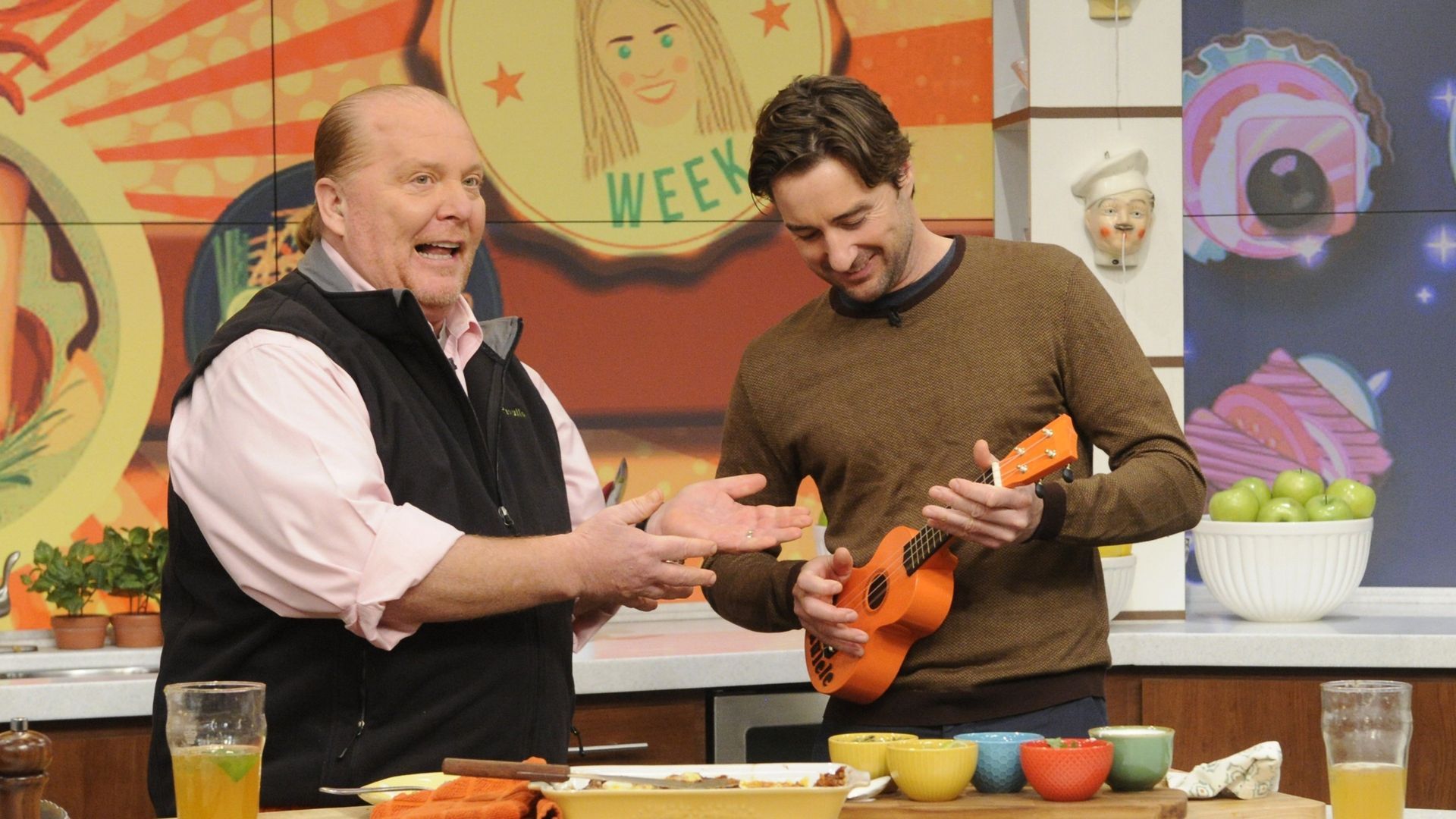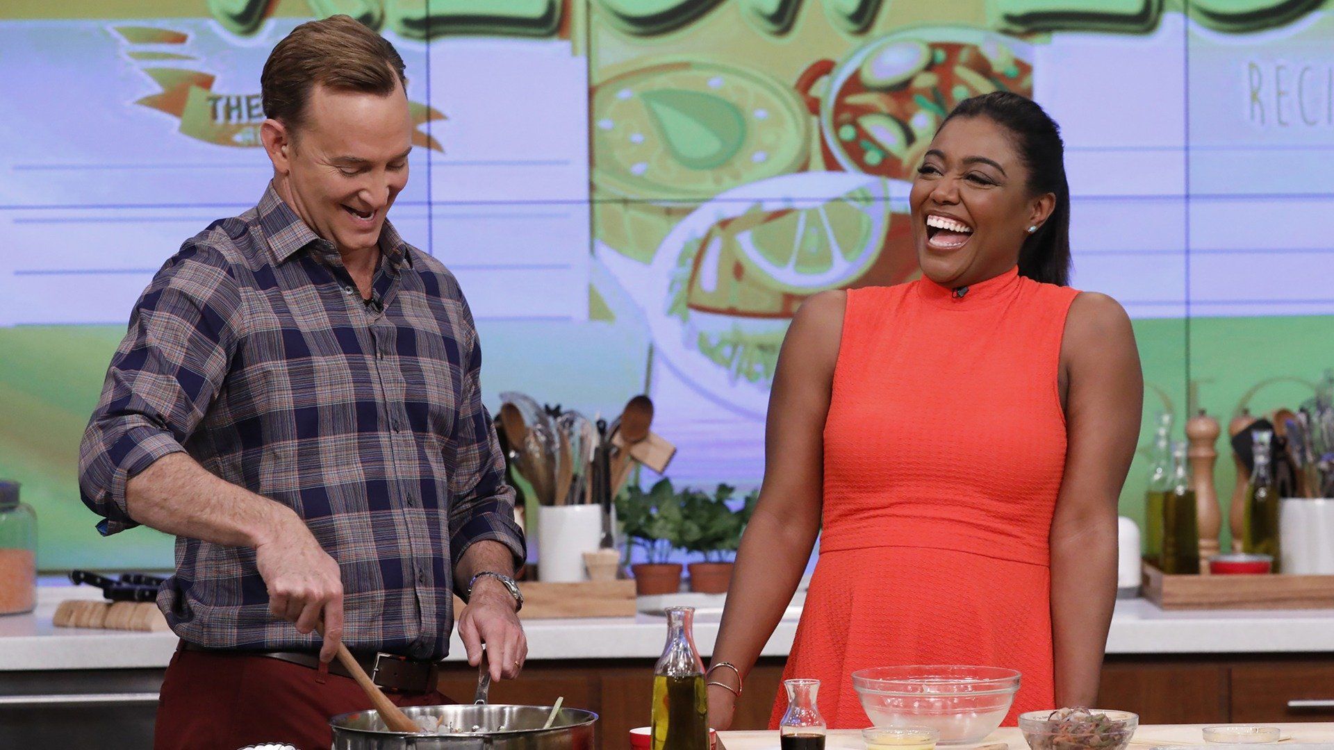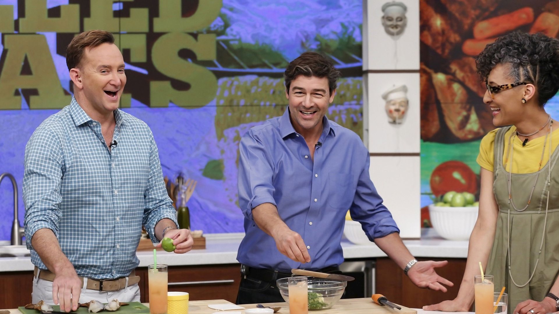 E1836th Annual Summertime, Funtime, Sunshine Happy HourThe incredible Michael Strahan (ABC's "The $100,000 Pyramid" and "Good Morning America") joins Mario Batali to prepare a sizzling T-Bone with Green Bean Salad. Clinton Kelly preps a refreshing Tiki Bar combo—a Mellow Monkey cocktail with Pineapple Teriyaki Meatballs. Carla Hall builds a Sundae Funday with a Banana Split Ice Cream Cupcake Bar. - Summer In A Snap