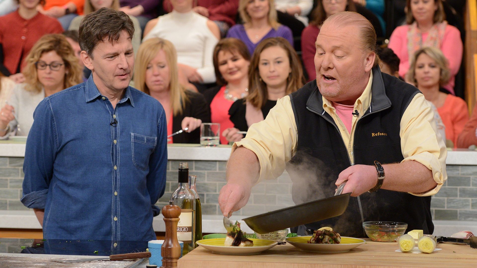 E156Viewer Chew & A: Spring EditionThe fabulous Diane Lane ("Paris Can Wait") joins Mario Batali in the kitchen to make a Spring Chicken Stew inspired by the French countryside setting of her new movie, and Michael Symon goes on a Mystery Monday adventure that's hot, hot, hot! Can he handle the pressure? And Clinton Kelly shows viewers how to make a spectacular Salmon Burger with Dill and Cucumber, teaming up with The Chew's in-house culinary stylist, Jackie Rothong! - Favorite Food Memories