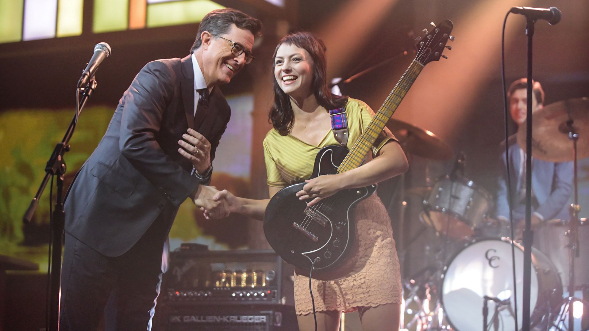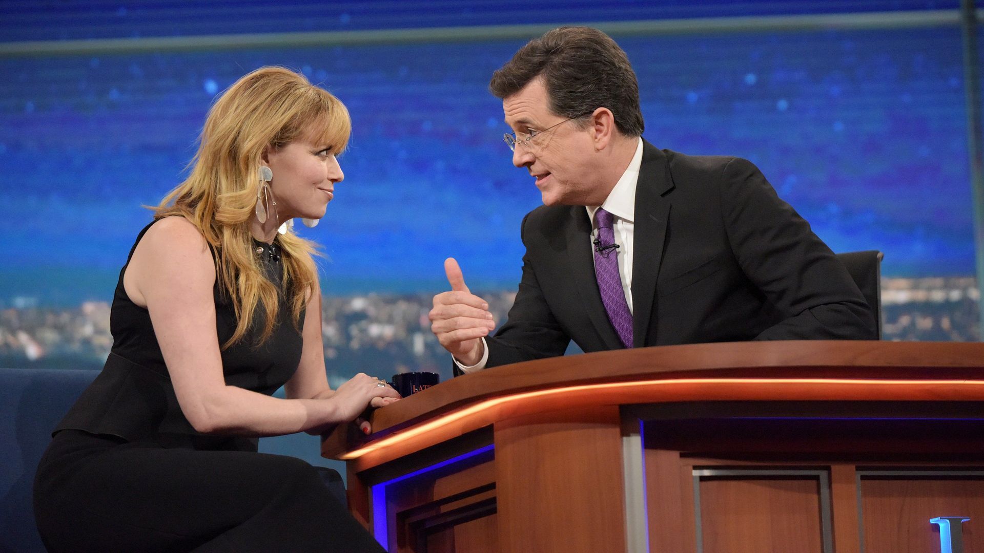 E25Carey Mulligan, Elvis Costello, Darlene LoveStephen Colbert’s RejecTED Talks. Carey Mulligan discusses ‘Suffragette’ and the British women’s suffrage movement. Stephen takes a meeting with her producer. Elvis Costello discusses his new memoir, ‘Unfaithful Music & Disappearing Ink’, and his father’s influence. Darlene Love performs “Forbidden Nights”, from her album ‘Introducing Darlene Love’, with Costello. - Sarah Silverman, Elijah Wood, Symphony of the Goddesses