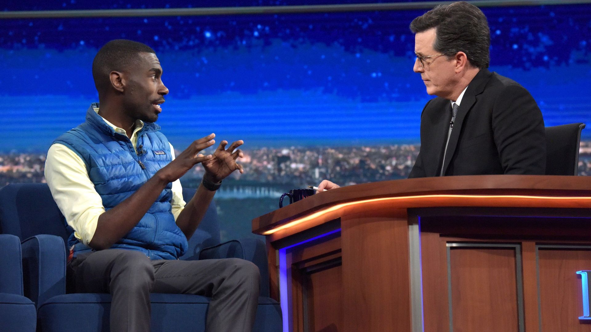 E5Emily Blunt, Justice Stephen Breyer, The Dead WeatherStephen faces off against Novak Djokovic. Stephen Colbert Gets All Up in Your Faith. Emily Blunt discusses 'Sicario’, in addition to having a vomit-off with Stephen. Justice Stephen Breyer discusses recent politics and his new book, 'The Court and the World’. The Dead Weather performs "I Feel Love (Every Million Miles)" from their album 'Dodge and Burn’. - Tim Cook, Jake Gyllenhaal, Run The Jewels with TV On The Radio