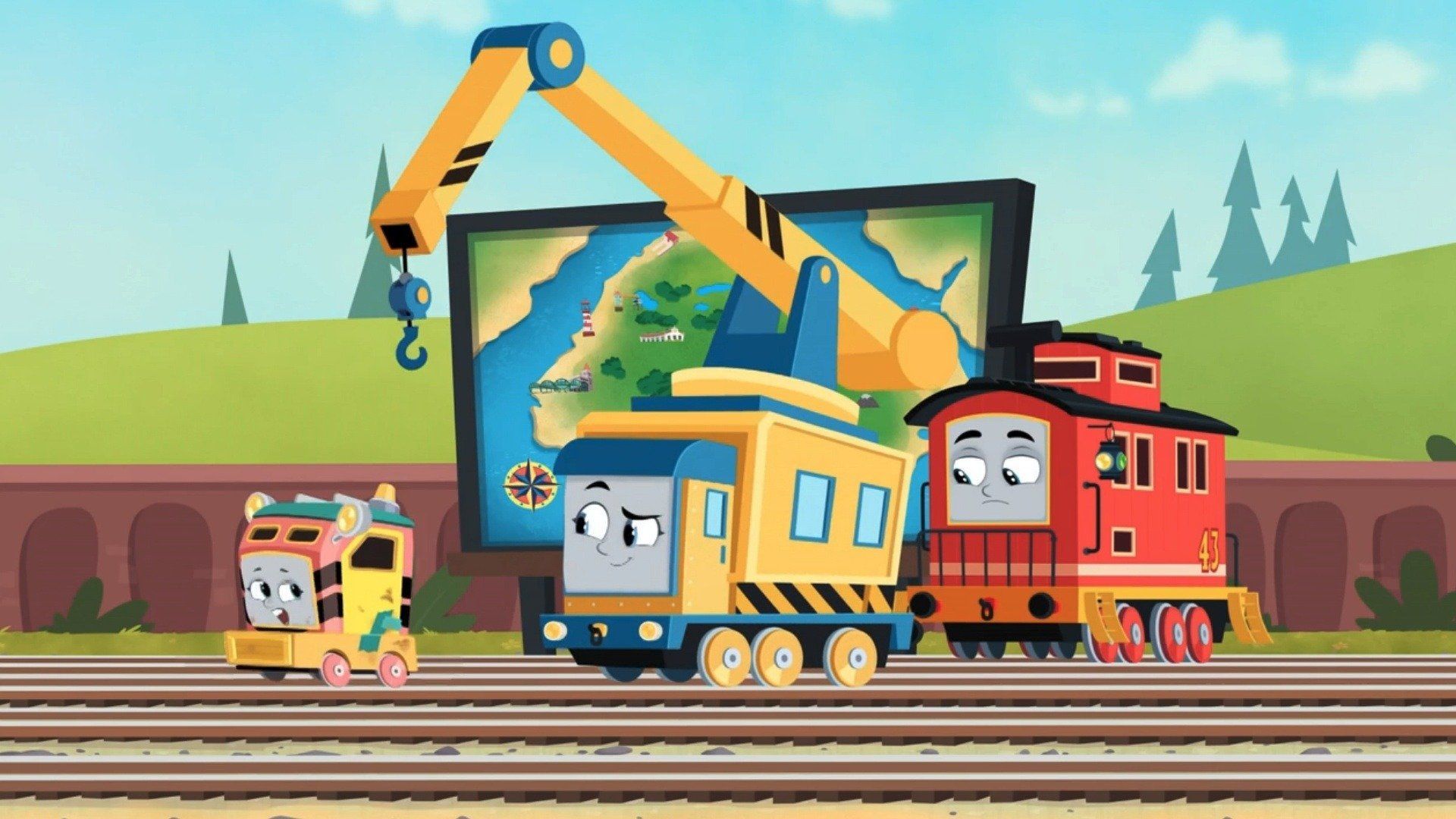 E43Bruno's Map MishapBruno is beyond delighted -- he has received the gift of an updated map of Sodor from Sir Topham Hatt! He and Thomas can't wait to use it to navigate their busy schedule for the day. But when Kana's speedy whoosh blows Bruno's beloved map up, up, and away, Thomas and Bruno team up with Percy and Diesel to recover it! While searching the island far and wide for Bruno's prized possession, the gang discovers that there is something more important than keeping their schedules -- their friendship! - Seeking a Safer Sodor